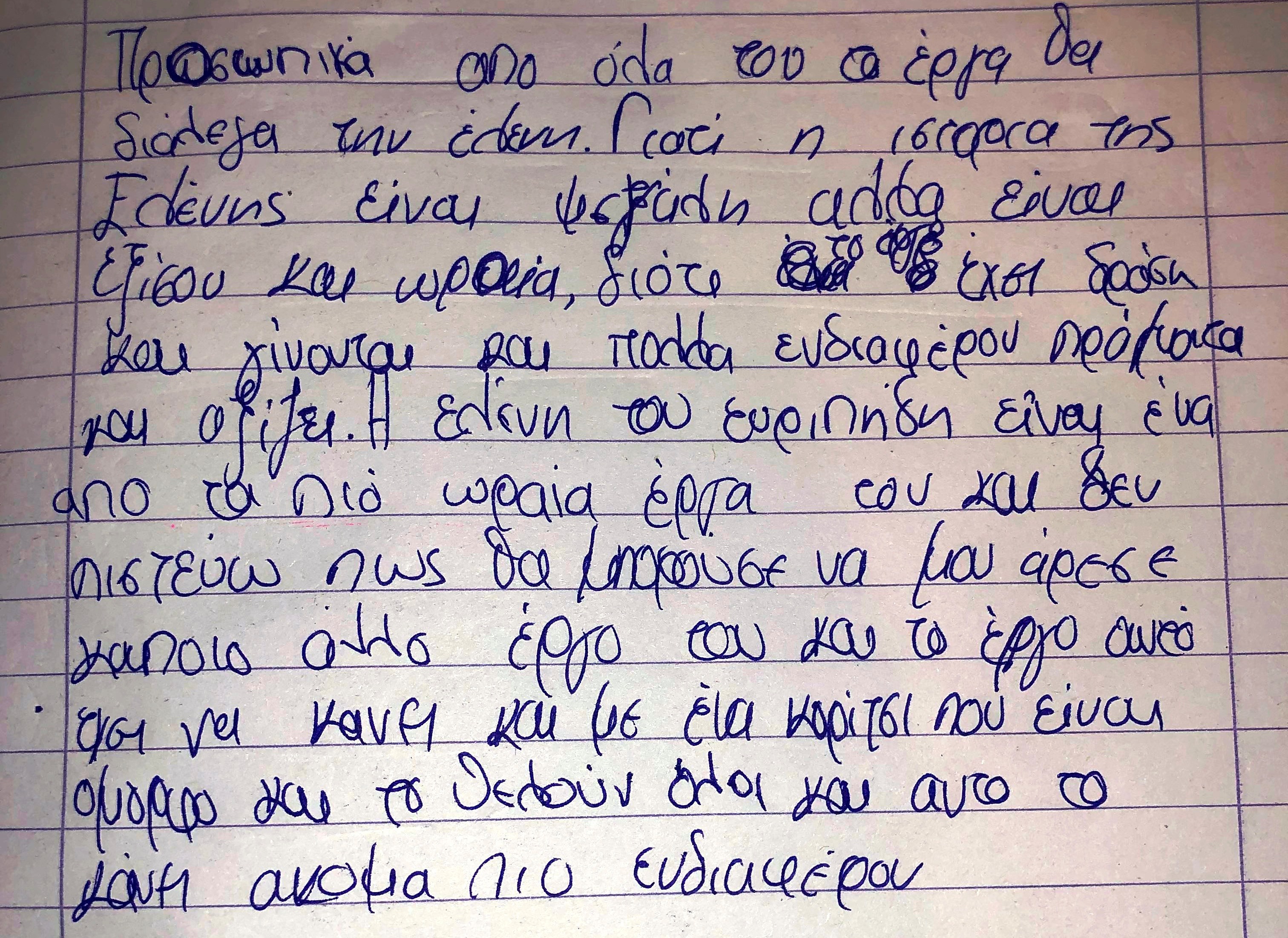 Από όλα τα έργα του Ευριπίδη θα διάλεγα να σκηνοθετήσω το πιο διάσημο του έργο του, την “Ελένη” επειδή μου άρεσε που Ευριπίδης είχε την ιδέα να αλλάξει την γνωστή μυθολογία και να βγάλει κάποια άλλη εκδοχή της. Ακόμη μου άρεσε το όλο θέμα, που το συνέχισε και μετά την Τροία, με τον Μενέλαο και την Ελένη στην Αίγυπτο που το σκάσανε επειδή ο βασιλιάς της Αιγύπτου ο Θεοκλύμενος ήθελε να παντρευτεί την Ελένη. Επίσης μου φαίνεται πολύ περίεργο που μετά από τόσες χιλιάδες χρόνια κατάφερε να διασωθεί. Πιστεύω πως άμα αυτή η ιστορία ξανά έβγαινε στο θέατρο θα ερχόταν πολύς κόσμος να το δει. Εμένα προσωπικά μου άρεσε το έργο του και νομίζω πως θα του έδινα μία άλλη πινελιά ως τραγωδία.